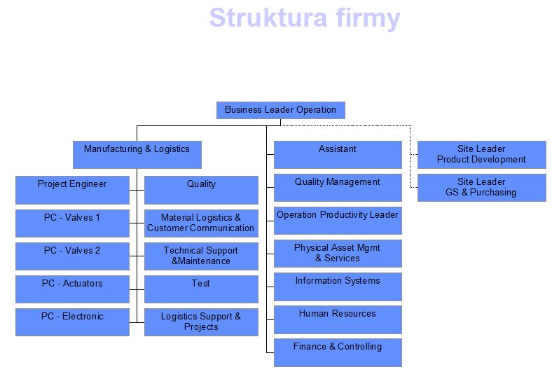 Struktura organizacyjna firma związana jest z jej specyfiką. Składa się z czterech samodzielnych kompleksów produkcyjnych, odpowiedzialnych za produkcję zaworów, siłowników, a także elementów elektronicznych: